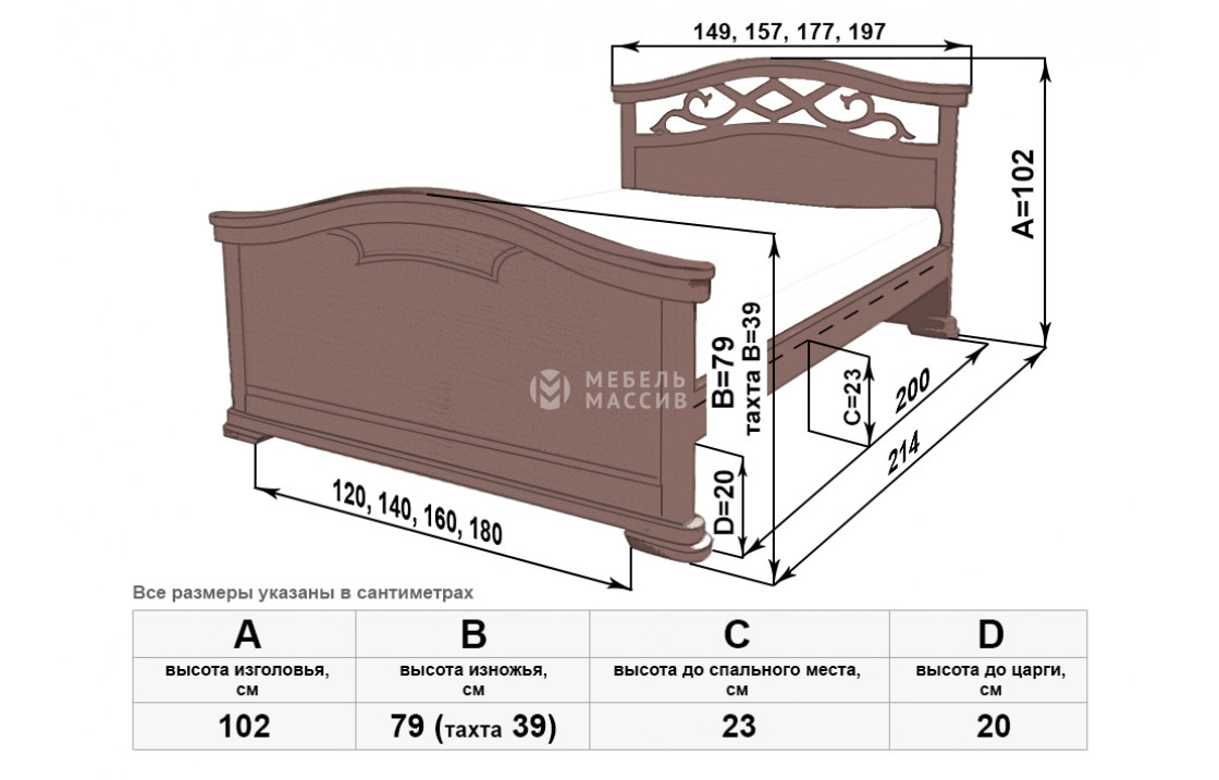 Благородная кровать Вирджиня сделана из качественного древесного массива. Изделие имеет изогнутое сплошное изножье и высокое изголовье с узором. Обе спинки плавно переходят в устойчивые ножки, которые защищают пол от повреждений. Купить эту прочную модель по выгодной цене можно в нашем интернет-магазине. Осуществляется доставка на дом по Оренбургу и Оренбургской области.| Размер | Цена | |
